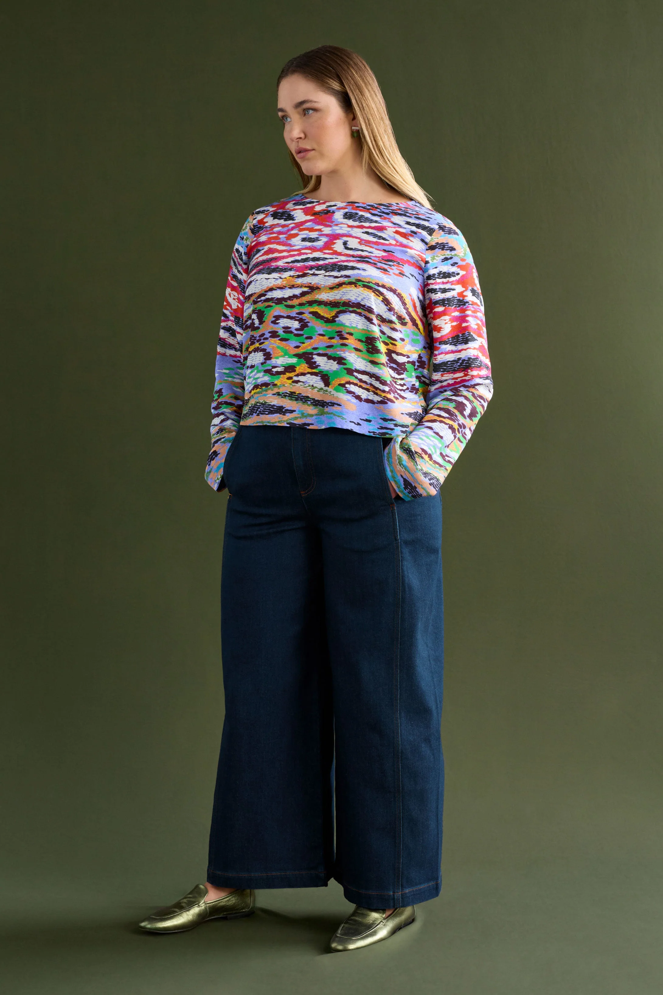- Slightly cropped to tuck into skirts, trousers, and denim