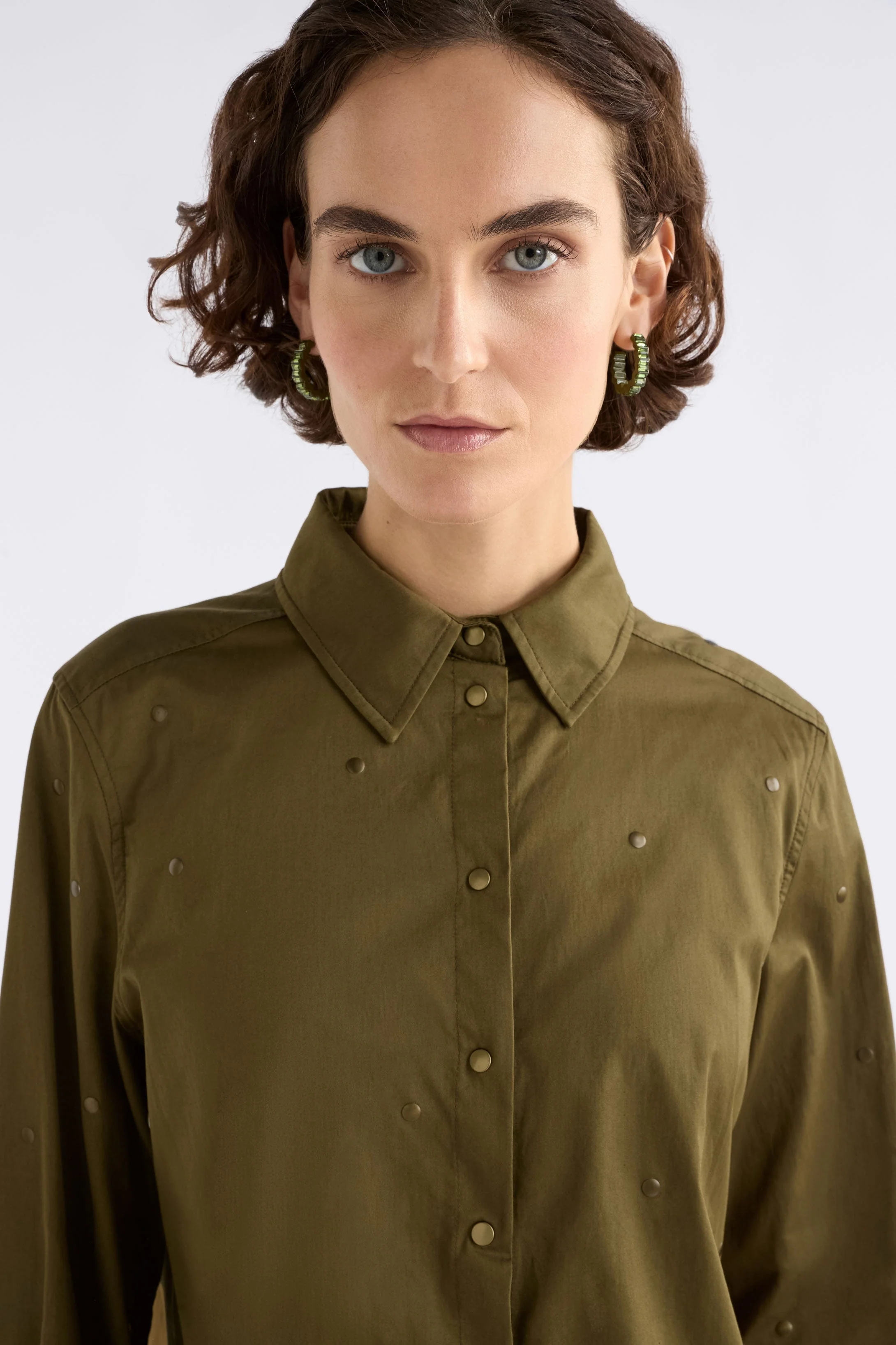 The Stuud Long Sleeve Shirt brings an unique edge to classic shirting with distinctive all-over metallic studs. A classic long sleeve shirt cut with press stud closure down the placket, slight dropped shoulders and back box pleat. This regular fit shirt features elongated high cuffs with two press stud closures. Finished with a curved, slight high-low hem. Crafted from a lightweight 100% organic cotton with some structure. Pair tucked into trousers or skirts or wear loose with our Pink Clay Kudel Pant for a smart casual look or with shorts and the sleeve rolled for high summer